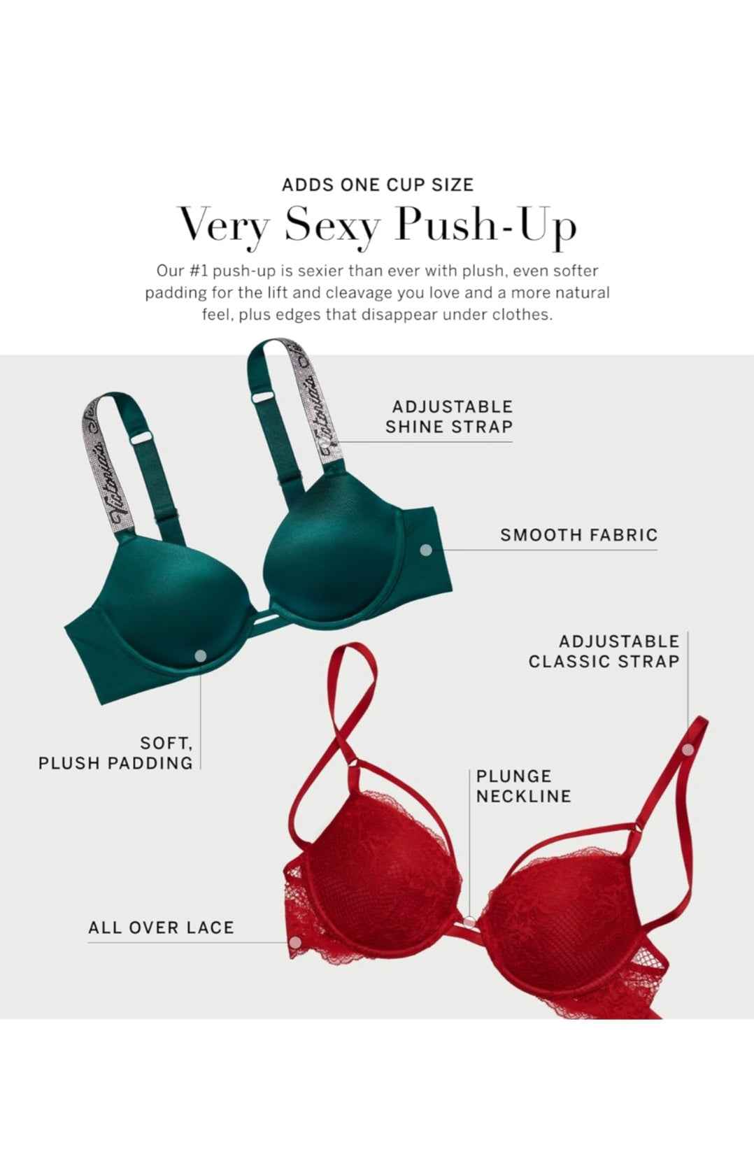 - Victoria's Secret El brasier push up muy sexy está diseñado para levantar y añadir 1 talla de copa. Este brasier levanta y mejora el escote para un aspecto sexy